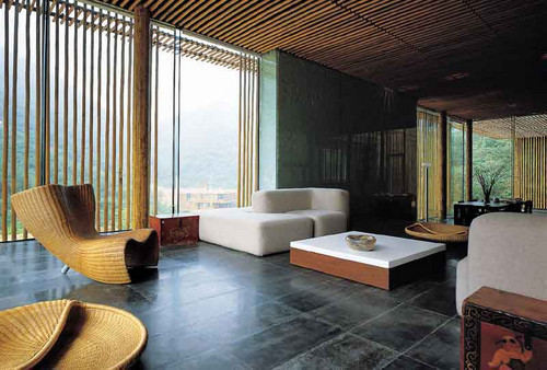 这个建筑是日本建筑设计师隈研吾的作品,叫“竹屋”。按照传统做建筑,首先要做“叁通一平”,“七通一平”,但这座建筑是建在一条山沟上,充分地利用地形建造,下面一层在山沟的底下,上面一层在山沟的上面。 这座建筑的外表都用用竹子包起来,隈研吾认为,竹子是中国的符号和象征,在世界任何地方看到竹子,人们就会想到中国,在长城边上建这样一座建筑是很有意义的,长城又是农业文明和牧业文明的分水岭,为了避免两个文明的冲突所以建立起了长城;现在世界面临的问题是东方文化和西方文化的冲突,东西方只有联起手恢复信任,消除敌意,世界才能和平,才能向前发展。