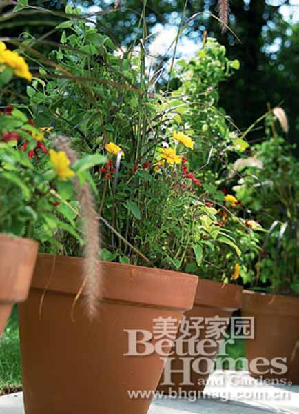 盆栽可以随便移动,不仅是很好的景观元素,也可以利用它来划分空间区域。这个休闲区沿着水泥地的边界,摆放了一圈粘土花盆,巧妙划分出就餐区。花盆中种植着容易养护的植物,如万寿菊、鼠尾草,它们为露台增添了绚丽的色彩,漂亮的颜色可以从春天一直持续到秋季。