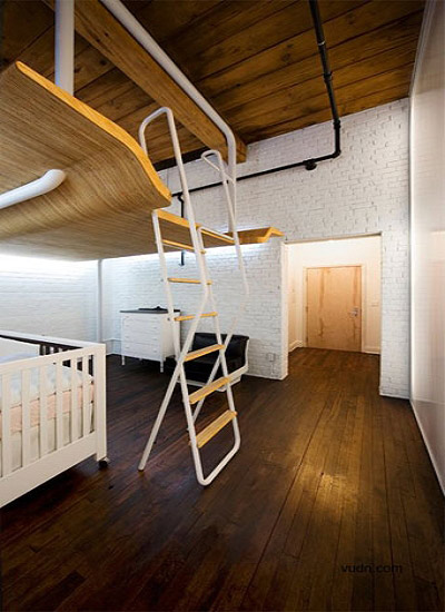 这个阁楼位于加拿大的蒙特利尔,总计面积700平方英尺,由L·McComber设计。因为他们需要建一个房间给新生婴儿,所以为业主专门设计了这个悬浮房间在新生婴儿床上面。