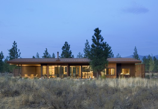 这个住宅位于一个疏散的林地,周围被山体包围,住宅设计呈现出两个互相交织的L形,一个覆盖的门厅位于一个L形的交界处,为人们提供休息和享受美景的安全之地。一个轻盈的遮挡式的L形结构创造出院落空间,它能帮助人们脱离季节风的影响,还能提供一个亲密的空间,远离邻里的干扰。建筑体量被控制在较低层面,以最大限度地减少木屋对山谷的影响。屋顶线条和墙壁延伸至景观之中,将山体的美景与住宅结构相融合。