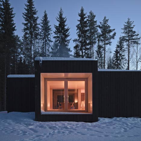 住宅所在场地位于一个马蹄形的岛屿上,朝北朝东。别墅十字形的构成使空间向着四个不同的方向延展。空间开阔精致。室外是全黑,而室内则是与之形成对比的白色。黑色的外皮使建筑消失在周围的景观中。住宅呈现出平平的屋顶,它构成对现代建筑固有元素温柔的。住宅有着很好的绝缘系统,它利用木材加热,是一个碳中和结构。住宅内部没有自来水,电力是通过太阳能提供的。