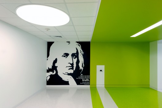 这次对密苏里州立大学大厅的翻修生成了一个新教室,一个为数学系设立的新电脑实验室。一个非正式的学生休息大厅被安置在走廊的交叉口,它呈现出新鲜的绿色,使空间从一个功能过渡到另一个功能。这个绿色的圆环空间是学生休息室的一部分,它鼓励师生间的友好互动。灵活的座椅和互动的玻璃墙鼓励自由的讨论和学习。牛顿的肖像位于中央走廊的结尾处,形象逼真,似乎是在与学生们做伴。
