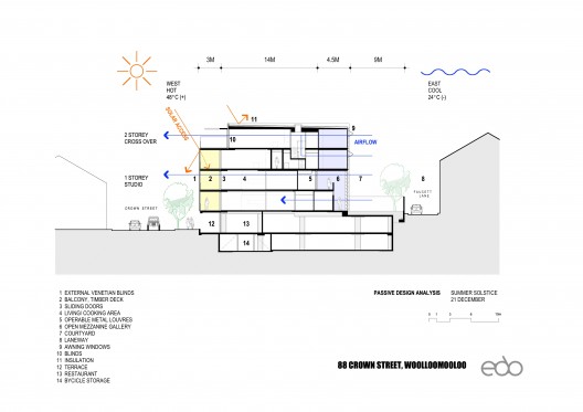 这个住宅项目有一个神奇的走廊结构,它不但是一个美丽的空间,还有非常重要的环境功能。每个公寓都有位于入口大门之上的玻璃通风孔,它们被铜制格子保护。夏季时这个走廊空间可以是清凉空气的一个热池,通过公寓激发十字通风。住户可以在没有空调和电扇的帮助下得到通风和凉意。公寓之间的十字通风是由走廊较低的温度引发的,这里的温度比建筑西侧要低15度。