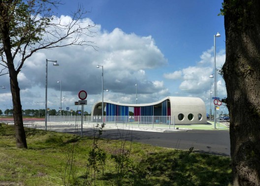 这个项目位于荷兰霍赫凯尔克,是Park+Ride的一个公车站,Park+Ride为六百多个车辆,自行车提供停车空间,还为换乘提供很多不同的选择。公车站呈现出百合叶子般的形状,三个结构向外延展,将室内空间打开。百合叶子是对附近乡村景色的暗示。结构主体是一个穹顶的混凝土壳体,三面被切开,包含很多圆圈,拱形和半圆。内部是一个三角形的金属核心,包括一个为残疾人准备的洗手间,储备室和司机休息室。建筑的形状奇特干净,它的开阔性反而创造出公共的安全性。