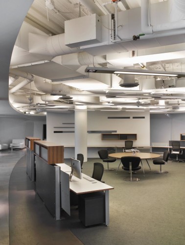 这是一个公司的总部办公空间,是为一个年轻的混凝土科技发展公司打造的,设计目的是营造一个智慧聚集地,鼓励互动,并反映他们正在开发的创新绿色产品。这是一个开阔流动的简约的空间,它能促进员工之间的互动并形成创新的思考方式。一进入空间,人们就会被直接带入公司中心区,通过互动和交流迅速成为其中的一部分,设计抛开传统的接待台和等待区,以一个长长的工作台代之,用以展示公司产品和充当一个会议桌。雕塑形和精致的建筑元素点缀在暴露的机械结构和粗糙的混凝土地板上,营造出能表达公司产品质感的独特空间。