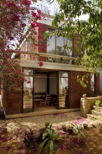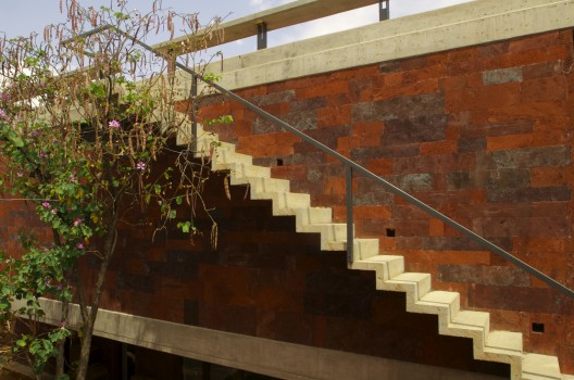这个住宅和工作室是为一个塑料艺术家设计的,它由两个同样大小的体量组成,客户想要在二楼的工作室处安插一个阳台。这个想法启发设计师创造出两个相互堆积且错落的建筑,低层的楼顶将成为高层的阳台。一个内置的楼梯成了两者之间的连接和转折。住宅位于一个不规则的场地内,与场地较短一侧相连,从而创造出一个开阔的花园空间,为朝北的工作室和朝西的早餐室提供良好的照明和光线,住宅本身就像一个窗帘,保护阳台免受阳光暴晒。