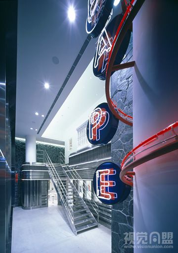 下面就是Wonderwall为Bape新设计的专卖店。专卖店外墙采用全玻璃,过往行人在远处就能看到店里的服装,同时其夸张、绚烂、大胆、令人有些眼花缭乱的的室内设计,再配以金属、玻璃的柜台和墙面、吊顶的装饰,让整个专卖店十分出众夺目。夜晚,灯光全部点亮时是专卖店最漂亮的时候,此时它缤纷的色彩和明亮的灯光便将专卖店的美展现的淋漓尽致。