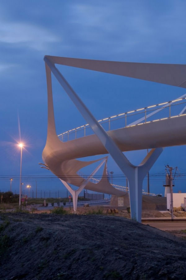 这座步行桥位于伊丽莎班女王大街,它并连接克洛克与奥斯坦德。它有两个功能:一方面,坐落于堤围泽地上的桥把海堤与绿化带连结起来,脚踏车爱好者和行人得以观光。另一方面,桥标志出海滨城市克洛克-海斯特的入口。桥的静态模型是一道102米长,横卧于四个支撑点上的连续横梁,使跨度处于28m/46m/28m的比较理想状态。