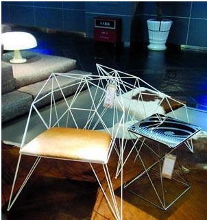 金属家具最经典的设计自然是充分利用它的特性,通过不同的线条组合,实现不同的设计效果。金属能与实木、人造板、包布、石材、玻璃等材质和谐搭配,而在意大利设计中常见不锈钢与皮结合。新维思咖啡奶牛皮椅用不锈钢线进行交错编织,做成了一把椅子。但这种椅子是不大适合人久坐的,为避免这款休闲椅太过冰凉,设计师人性化地用可爱又温暖的牛皮软包搭配,为这款造型别致的椅子带来久违的童趣。售价:3580元。