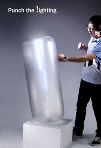 这个像倒置的沙袋一样的东西其实是一款落地灯。它的独特之处并不仅仅在充气的设计上,还在与它特殊的点亮方式。要点亮它,你不断的用力击打它——真是够欠揍的!