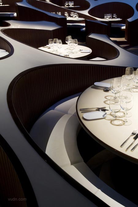 印度孟买蓝蛙休闲酒廊被用来作为一个音乐场馆,一个复杂的录音工作室,一家餐厅,酒吧和现场音乐演奏的场地。不同大小的圆柱亭座椅之间容纳4和10人,并安排在不同的高度,以便错开各级高度的观赏视线。反射灯光的8毫米压克力板,反射出不同的灯光设计。崎岖不平的触感墙壁有助吸纳噪音。