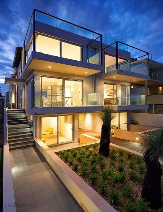 位于澳大利亚Maroubra的Walsh-Wykes House,对称的房屋设计。对称的两个楼梯,阳台,窗户等等。是空间既独立又相互联系,既是单独的两个空间又是一个整体。