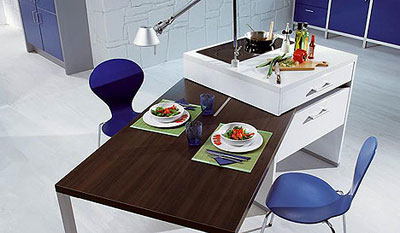 这个名叫CookIsland的餐桌,在把矮桌子拉出之后可以容纳5个人围坐就餐,而且可以根据空间大小随意调整位置,比如说两个人吃饭的时候,就可以不用完全拉出来,这样就节省了居室的空间。 这种设计最适合小房子的家庭使用了。
