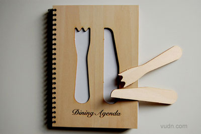 意大利设计师Sara Ferrari和Marcella Fiori合作设计了一本装订迷人的餐具垫子。封面采用木头制成,上面嵌有14把一次性的刀叉,餐具垫子的一角还带有的方形便笺条。