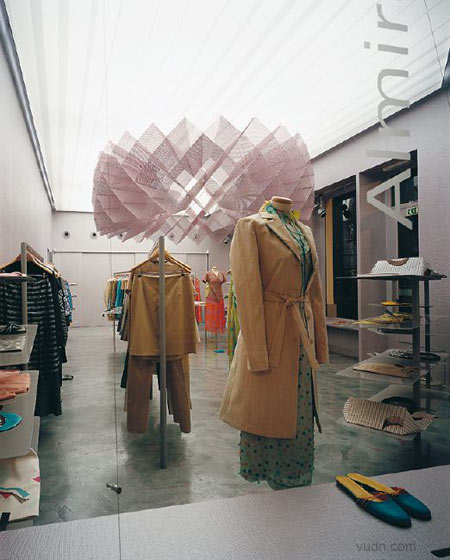 斯洛文尼亚的Almira Sadar精品店设计。一个直径为3.2米的灰紫金属花吊在房顶,下方1.5米高的长条平台。采用混凝土地面。明度似乎一成不变的,并主张耐久性。