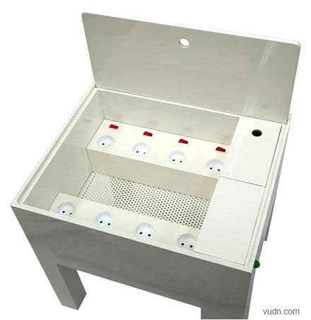 桌子上带一根电线,会有什么作用呢?一起看看吧:这款产品同样是将插座和杂乱的电线隐藏在一个容器内部,从而达到收纳的目的。所不同的是,这款产品的体积更大,在提供插座、收纳电线的同时还能够作为一张小桌子来使用。