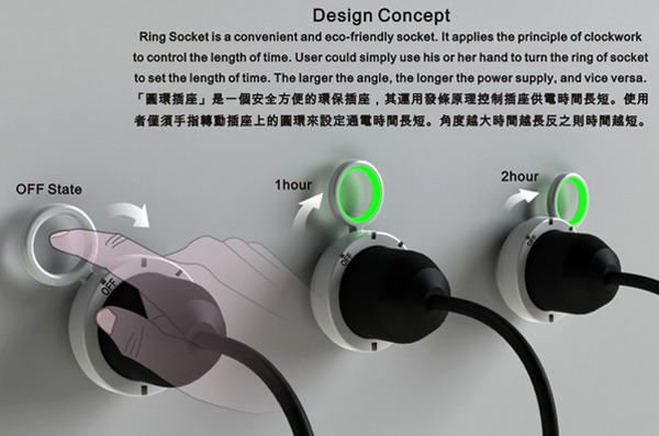 设计一小步,节能一大步。不要以为只有节能电灯哦,其实也有节能插座的。看看这个定时插座,它是一个非常安全的环保插座,其采用发条的原理来控制插座供电时间的长短,就好比一个附加在插座上的定时器。使用者需要用手指转动插座上的圆环来设定通电时间的的长短,圆环角度的大小决定了供电时间长短,圆环上还配有LED灯,分别可以显示待机、使用中以及关闭三个状态,而且亮起来的灯的颜色也不同!