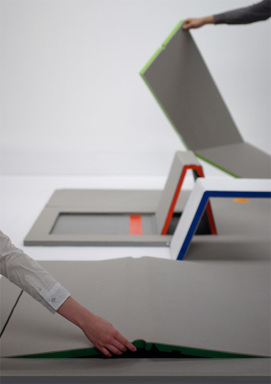 Land Peel 是由日本设计系学生 Shin Yamashita 设计的一款多功能的地垫,它们的功能就体现在折叠上了,对地垫进行全方位的切割,当它铺平之时就是个普通的地垫,当我们开始折起它们的时候,就变成了一个办公桌、一个茶几、一个靠背椅等等。很好的设计,为我们提供了一个创意的休闲空间,相信会受很多人稀饭吧。