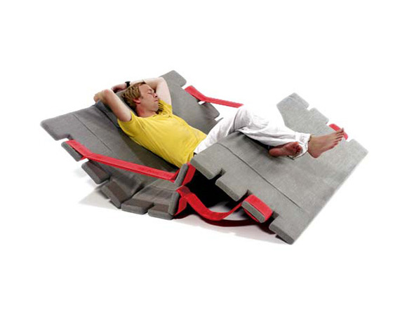 市面上的沙发种样式各异,一般的沙发最多能够拆散组装成一张简易的床,但是拆卸过程显得麻烦,且每一个个体都很笨重,搬运起来显得极为不便,设计师Alexander Munk 对此进行了改良,创制出了这款实用的轻型多功能沙发,与传统不同的是该沙发由三块主体构成,中间由红色宽线连接,可以变换成躺椅、床垫、带隔层的单人床,每一块沙发的倾斜角度可以任使用者选择,模块化的构造也便于储存和放置,节约了房间的空间。