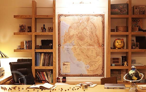 枫木质地的落地书架,在造型上仿佛一堵木质的墙,使房间的一切显得井然有序,又在一定程度上阻隔了噪音,还给书房一个静谧的阅读环境。