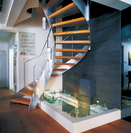 螺旋楼梯带来空间的通透感,背景墙壁采用与起居室电视墙一样的材质,