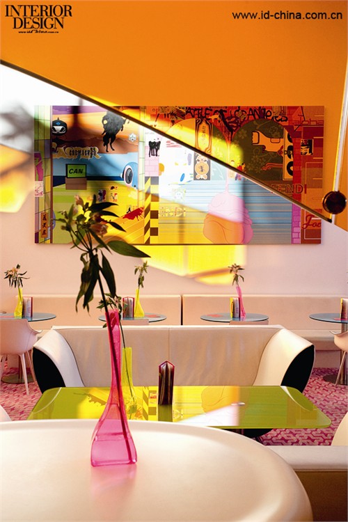 进入 Semiramis Hotel 的一霎那, 地中海热烈的阳光肆无忌惮地透过清澈的落地玻璃窗洒满室内空间,扑面而来的绚丽色彩让视线变得无从安放。橙黄色的楼梯,粉红色的地板,米白色和玫瑰色的沙发,以及水蓝色和草绿色的透明小桌,将这个空间打造的纷繁却不嘈杂,尽管色彩饱和度极高,却井然有序。墙上布置的艺术画作别具匠心,空间里的主要色彩几乎都可以在画作中一一对应,跳脱的色彩经由这幅画作得到了和谐的统一。家具和空间的色彩已是如此明理,Karim Rashid 并不会因此而忽视对饰物的重视──紫红色的摆件有条不紊地布置在水蓝色和草绿色的小桌上,成为不可或缺的点睛之笔。休息处的隔断玻璃与楼梯采用了同一色系的橙黄色,既与楼梯遥相呼应,又滤去了刺目的光线,使得休息区的光线有了夕阳余晖的温柔色彩。