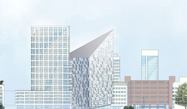 内部空间则满足了各种商业需求,设置了客房、公共酒吧、餐馆和办公室等。建筑的外层以对角角度“提升”,显露出大堂、酒吧和餐馆。