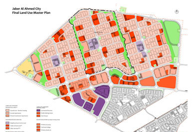 Jaber城有一套层级式的娱乐设施和用地。四座公园在社区旁一字排开,并连接着北部规划中的海岸公园。清凉的海风通过这些公园进入到居住区的核心地带。