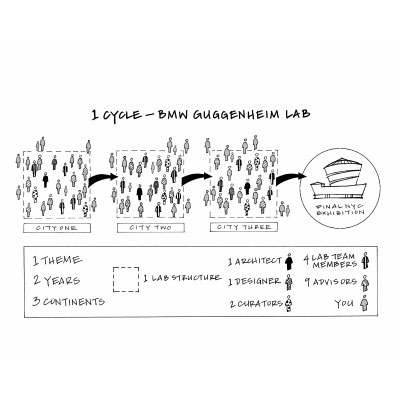 宝马古根汉姆实验室将是一座创意巧妙、可拆装移动的建筑物,从一个城市巡游到另一个城市。它将聚集全球胸怀远大志向的思考者,并成为公众对影响城市生活的主要议题集思广益的平台。六年中,共将建成三所宝马古根汉姆实验室,它们各自拥有不同的建筑师、平面设计师和主题,每所实验室将在两年的生命周期内在全球三个大都市巡游。
