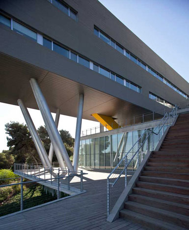 海法大学(Haifa University)位于卡梅尔(Carmel)山的山脊上,可以俯瞰海法这座地中海城市。学生中心的下面就是一个深谷和海湾,地势十分陡峭。山脊上的道路延伸到整个校区,为了和景观交融,建筑的房顶低于景观道路之下。
