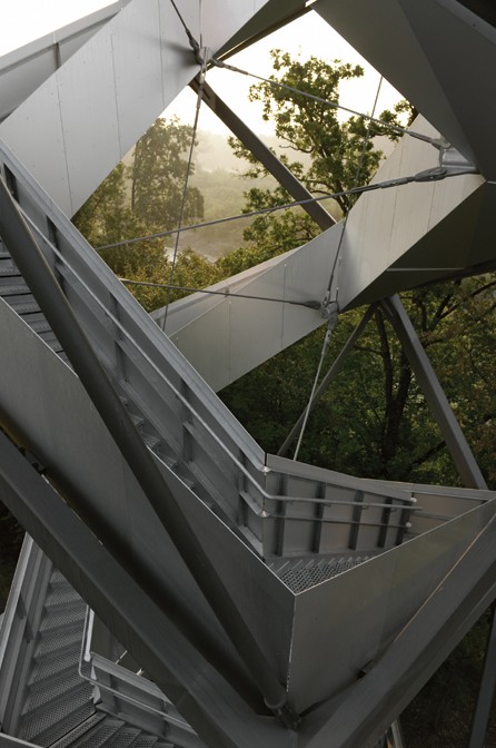 又到秋凉登高时,即将逝去的匆忙一年中,有多少人只顾低头登攀,而忽略了沿途的风景?德国Terrain:Loenhart&amMayr公司通过营建这座位于奥地利穆尔河畔的气象观测塔,传达出对使用者感受的情感关注。观测塔的双螺旋结构的阶梯为上下行提供了独立路线,闲庭信步中让游客亲身感受河流潮汐变化及周边的丛林形态。不仅是唤起人类亲近自然的一种有效手段,同时本身也自成一处风景。
