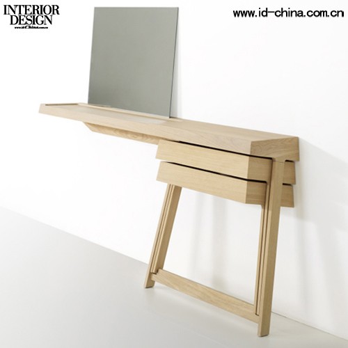 由喷漆栎木制成的折叠抽屉由铰链连接,因此还保留了可抽拉的滑动作用,悬在抽屉柜身之外。木头桌子腿比第一款更短,纵向感觉桌子更加实用,因此在背墙方向上摆设了一面玻璃镜。
