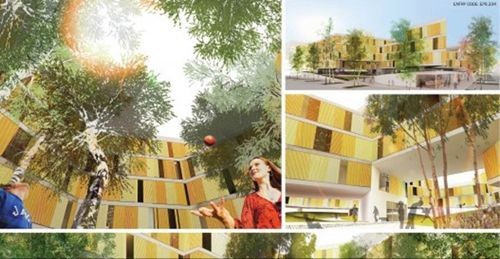 它应该是这样一种尺度:当孩子们在庭院中玩耍时,房屋中的父母能听见孩子们的笑声;当孩子们抬头仰望时,他们能看清窗口中父母的脸孔。因此设计师认为建筑的层数以两至三层为宜,最多不超过四层。这样的建筑高度将允许树冠从屋顶伸展开去,吸引鸟儿盘旋歌唱,居民也能更接近自然。