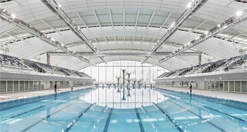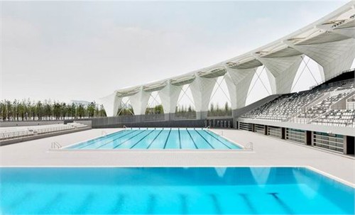 曲线形的体育馆建筑包含了一个室外游泳池,并在视线上与一系列人工池塘和小岛相连。平静的水面反射了建筑物的倒影,将周边分散的区域连接到一起,并增添了整个竞赛场馆区的自然氛围。