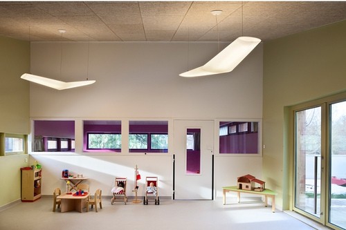 这个托儿所包括5个建筑单体,每一个单体都富有童趣,并且有自己独立的场地和入口。对基地和任务书的研究之后形成了这个方案,直接回应了项目自身的环境。设计了一组和主要道路垂直布置的房子,避免了对场地原有植被的破坏。每个房子都有特别形状的屋顶,这取决于房间内部的功能属性。这个房子很特别的地方是木头的使用,除了建筑室外采用的木结构框架外,在室内也采用了特殊的木纤维刨花板,即提供了温馨的木屋感觉,同时确保了室内优良的声学性能。