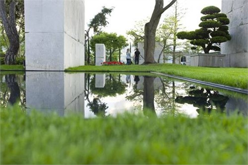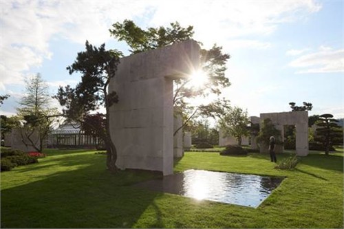 景观建筑师将当地的砂岩通过框架固定,形成了形状各异的墙。在这砂岩背景墙下看树,这些大多数来自东方的树似乎也具有了东方的禅意。