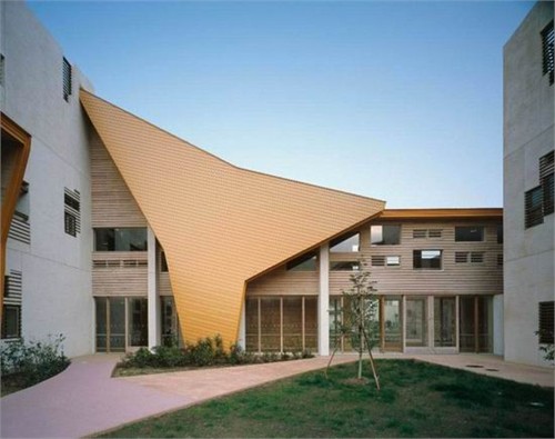 这个设计采用了日本传统的木建构技术,整座校园几乎都是用长野县的木材建造而成的。建筑整体形式以及屋顶被设计成了有趣的倾斜体,参观者可以从外部清楚的辨认出这座独特的建筑物。黄色的树枝状结构突出了建筑的整体构架同时也成为这一地区极其醒目的视觉标识。