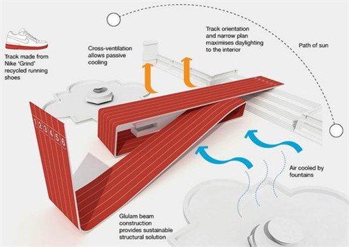 五环建筑弯曲的镜面表皮反射了广场周边的景色,为前来参观的人群提供了一个完美的拍照背景,也为持续不断的活动和生气勃勃的庆典提供了非常契合的平台。在场馆内部,触摸屏幕和互动式地图为人们提供必要的信息,内部电力均来自屋顶上的太阳能光电板。投射在室内外墙面上的影像不断更新,为参观者放送精彩的视频和节目。
