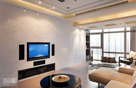 以整面的雪白银狐大理石自玄关进门至观景窗前的设计,内嵌方式规划视听器材,透过间接光源,深具层次魅力。