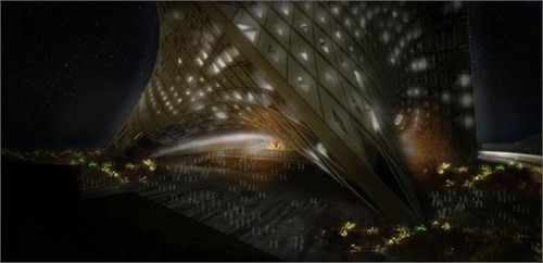 博物馆的画廊被安排在一个连续的边缘坡道上,这一空间围绕着艺术资源中心螺旋向上。行政管理区则位于建筑的最顶层,而儿童博物馆位于建筑底层。在内部布局交叉的地点,一系列连续的金属板从一个角落延伸到另一个,支撑了整个外部结构。外表皮包裹在主要的承重柱子上,形成了一个双曲线形的玻璃立面结构,这种表皮结构可以帮助收集雨水、放置太阳能光电板并安装活动窗以促进室内通风。建筑周围的园林区域内种植了超过750~1250棵树木以吸收各种设施排放的二氧化碳废气。