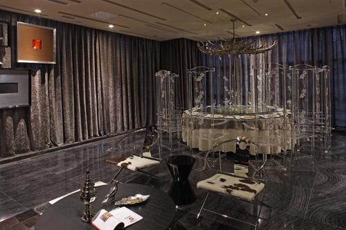 设计从东方传统元素中汲取灵感,大胆的加以“破坏”和“否定” ,从而创造出一个全新的意念,一个具有时代气息的意念。从对传统东方元素的偷窥中……在残破的被剥离的传统符号中抽象表达,寻找出最性感的地带,文化、艺术,黑色、白色的表象背后,肆意地表达一种艺术的力量,无形中增强了空间的神秘张力。中国传统磨漆画艺术,浓烈的红色大漆,饱满深沉而斑驳,肌理感含蓄内敛。传统紫砂工艺的提梁壶被大胆“破坏”;以当下的设计形式演变成既具功能性的接待前台又如大厅中的纯白色当代装置艺术品;一颗颗珍珠透过玻璃和光影的洗礼,有序地拉出优美的弧;摇曳的烛光、烛台;朴拙的石材栓马桩;金属装饰品;以及青花瓷的图案。设计师利用色彩、材质、光影以及造型的穿插、对比、和谐所产生的张力,来引起来者的共鸣,传达出空间要述说的东方内在精神。