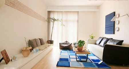 午后的阳光照在了蓝、白拼布风格的地毯上,让宁静的清爽气息弥漫在了空气里。整个空间是如此的和谐又惹人爱。