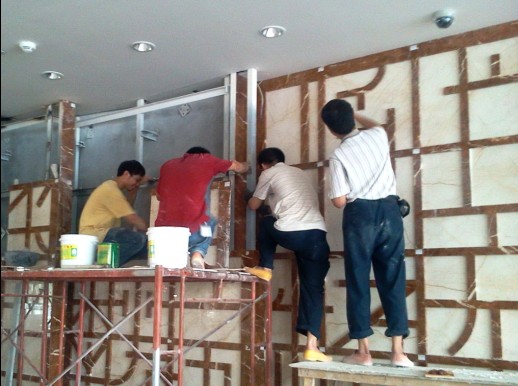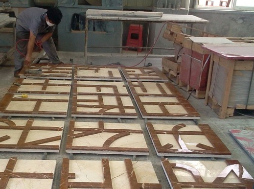 图4-5 在索菲特金大理石规格板上面,加上一块防护垫,将试拼OK的波特金线条摆放上去,初步粘接[page]