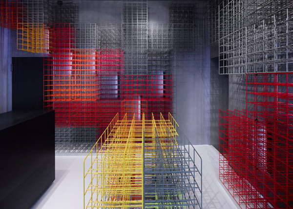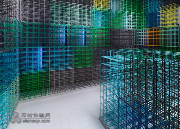 这次,设计工作室Furch Gestaltung将数学矩阵之美应用至Weinhandlung Kreis酒柜的设计中,让人惊叹与赞美之余,也满足了Weinhandlung Kreis想把12000瓶酒放在70平米空间里存储的窘迫需求。他们将特殊材质的线焊接成立方体,每个立方体有25个插槽,适用于任何形状的酒瓶。立方体底部外层突出,便于酒瓶直立放置,以致呈现产品的全貌。同时立方体被喷涂成五彩的颜色,视觉美观的同时更利于红酒分类存储。“这家商店应只有酒,没有家具。既是存储间,也是店面。就类似一个电子表格,不浪费任何空间的红酒数据结构。”