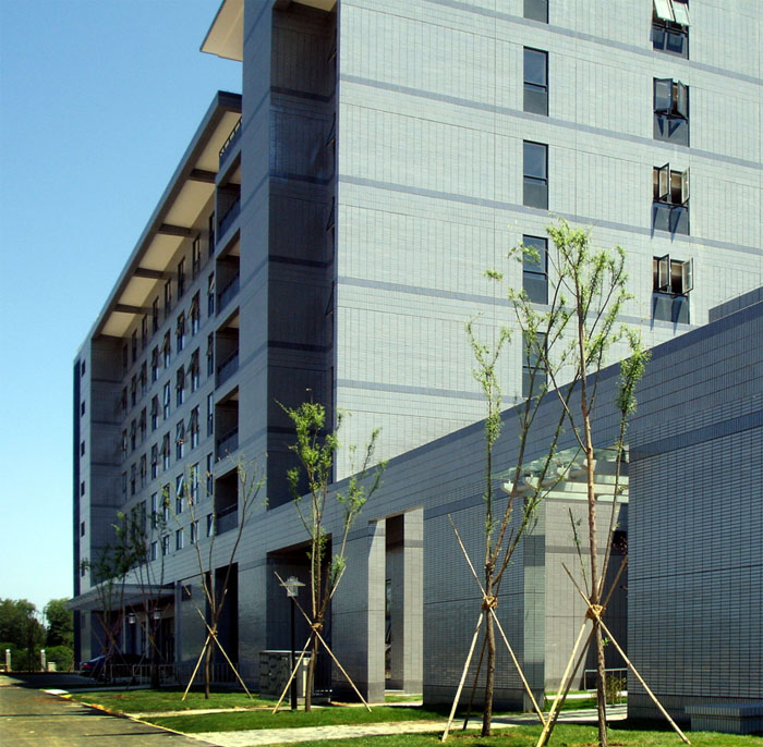 环境景观:总体布局体现西侧城市绿地的景观共享。主入口绿化广场布置绿地、水池、小品,体现运动精神和奥运主题。室外运动场地周边均为大乔木绿化,形成树阴遮阳。运动员公寓楼设置室外休闲活动绿地。硬质地面采用透水砖。