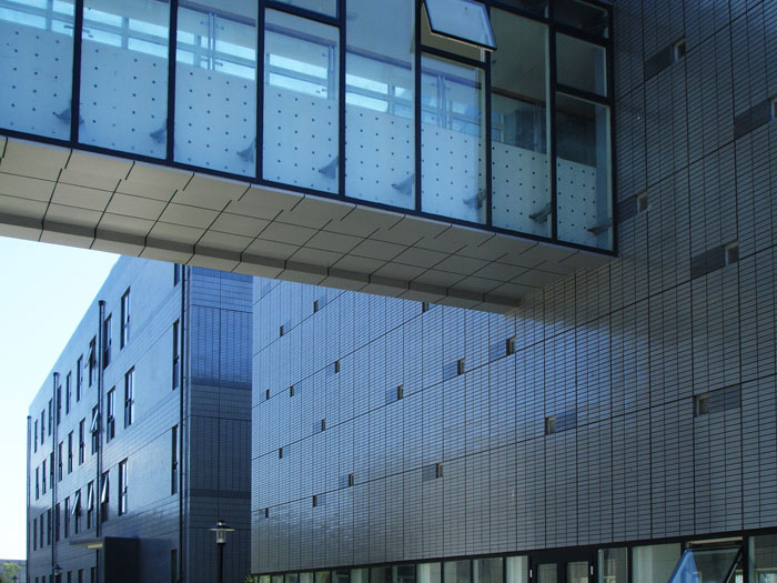 选用材料与新材料:训练馆屋面采用银灰色金属板,外墙干挂加气混凝土板(目前全国正在推广)表面银色氟碳漆,墙面均质不锈钢光点。点式、明框、隐框玻璃幕墙。公寓与科研用房外墙采用金属面砖。