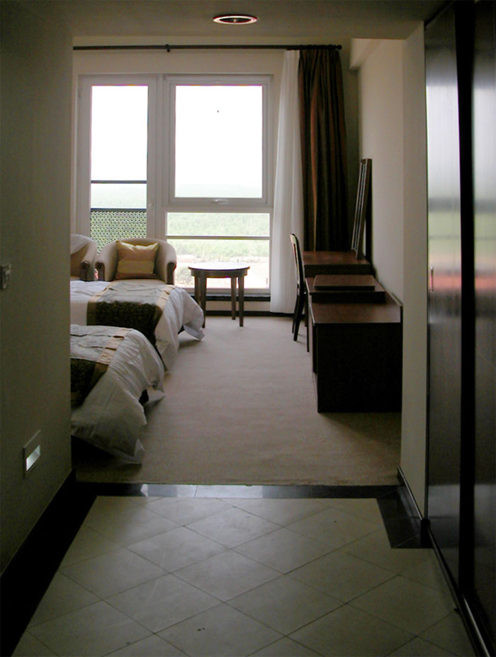 室内空间:训练馆均为单层大空间,方便使用与疏散。公寓科研楼疏散面积加大,并设无障碍疏散坡道。公寓科研楼之休闲厅四面通透,阳光充足,与其西面和南面的装饰围墙合成了一个隔绝噪音,安静的庭院空间。训练馆入口空间设有内庭,丰富室内景观。训练场馆设有椭圆型天窗和侧窗,充分利用自然光和自然通风。玻璃采用高效热工玻璃,减少热辐射。天窗采用漫反射玻璃,有效防止眩光。大空间采用分层空调,节约能源。游泳馆地板采暖,提高舒适度。