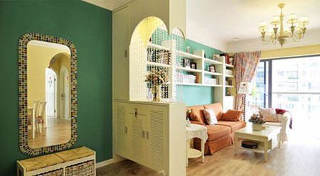从这个角度可以看到客厅的全貌展示,玄关处的镜子装饰的很别致,精美的马赛克墙砖,藤艺的收纳筐,玄关柜用珠帘隔断,随风灵动。