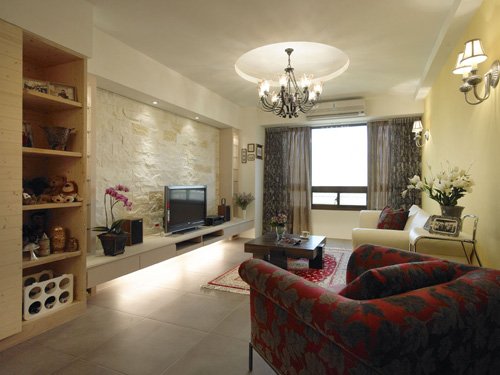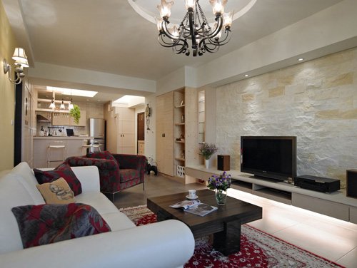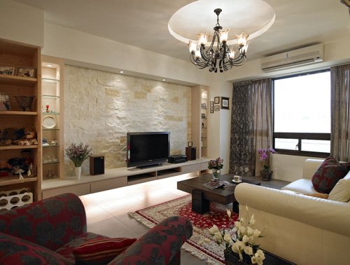 石材铺陈的电视主墙,悬浮式柜体设计和缓了视觉重量。