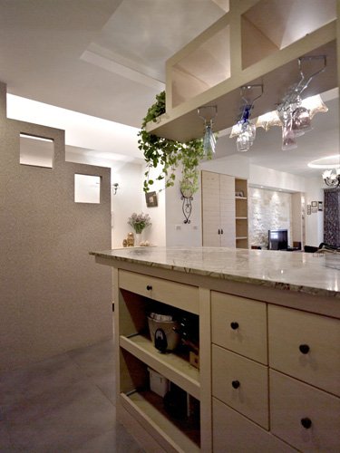 吧台规划满足收纳功能,同时也避免餐桌置入后动线过于拥挤问题。